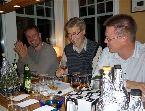 Kvällen fortsätter och lite slattar kommer fram på bordet. Vi språkar och skrattar. Peter F överbevisas om Iphones förträfflighet. Han påstår att det bara är vissa appar som är roliga ( i detta fall Akinator) men vi andra är säkra på att han inom kort knallar iväg och köper en ny Iphone. I takt med att whiskynivån i flaskorna minskade insåg vi att vårt förråd av dessa härliga droppar minska alltför fort och antal flaskor inte är så många de borde vara. Diskussioner inleds om nästa års medlemsskapspeng. Den får nog höjas om vi ska kunna fortsätta. Mer diskussion och beslut följer säkerligen på nästa provning som är hos Jocke den 5/11