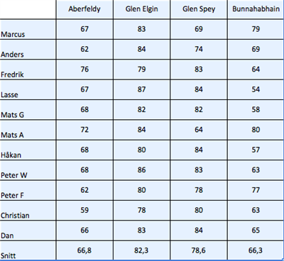Kvällen sista var också kvällens i särklass sämsta tyvärr. Vi testade den senast i april 2010 så flaskan har varit öppnad under ett år men har väldigt tydligt försämrats under året som gått. Väldigt kraftig försämring dessutom. Den var sur, doftade bensin och etanol och var allmänt taskig. Smaken var definitivt inte bättre. Mycket metallisk, kändes som en OBE men det kan det inte vara. Metall, kort och sur var det vi alla enades om. Inte alls bra. Peter W tyckte doften påminde om en "pubrökare" och alla vi som var med honom på puben i Dufftown vet alltför väl vad han menar. You bastard!.... :-)
