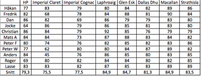 Sist ut i första flighten blev en Islay. Den var fet, mycket rökig, en del tjära och läder. Som sig bör i en Laffe med andra ord. Smaken bjöd på ännu mera tjära, en torr rök, plån och sömta. Salivgivande tyckte några....