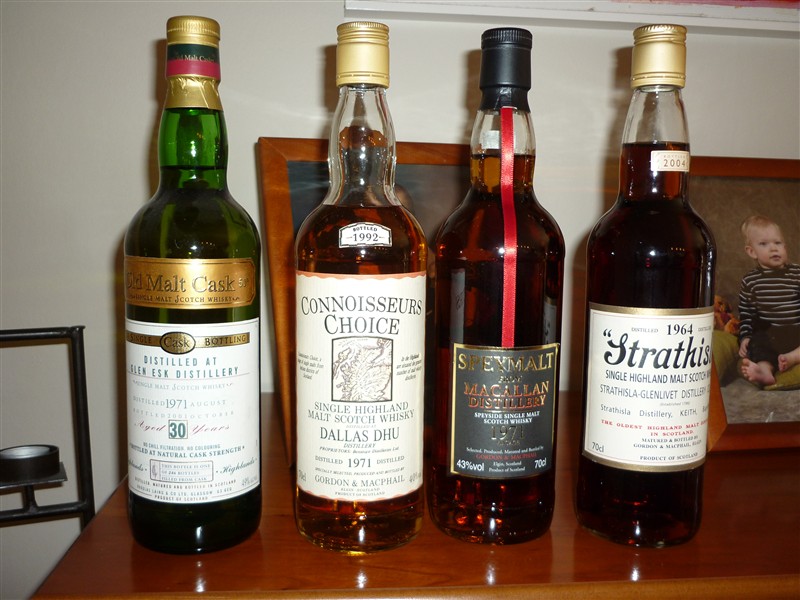 Fligtht nr 2 dukas upp på bordet. Dessa är inte blinda utan består av 3 st whiskies destillerade 1971 samt en 40-åring.
