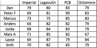 God sak det här. "Det här är nog en whisky på fredag....också" myntade Dan. Stickig tjära var det gemensamma omdömet på doften. Tjära, olja, läder och en lång finish enades vi om i smaken. Den lyfter inte riktigt och även denna flaska har varit öppnad lite för länge. En eloge till Marcus som spikade Lagga DE (även om han hade fel på 1 år. Imponerande mannen)