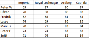 Väääldigt mycket frukt i denna. Blandat med både kola, vanilj och ljung. Betydande andel päron. Vi upplevde den som ganska salt, fruktig och kolalik i smaken. Summa sumarum fick den både ris och ros och var kvällens vattendelare. Poängen sträckte sig från 68 upp till 87 så den var inte lätt. En perfekt wirre om man vill sänka en hel pava - Håkan!