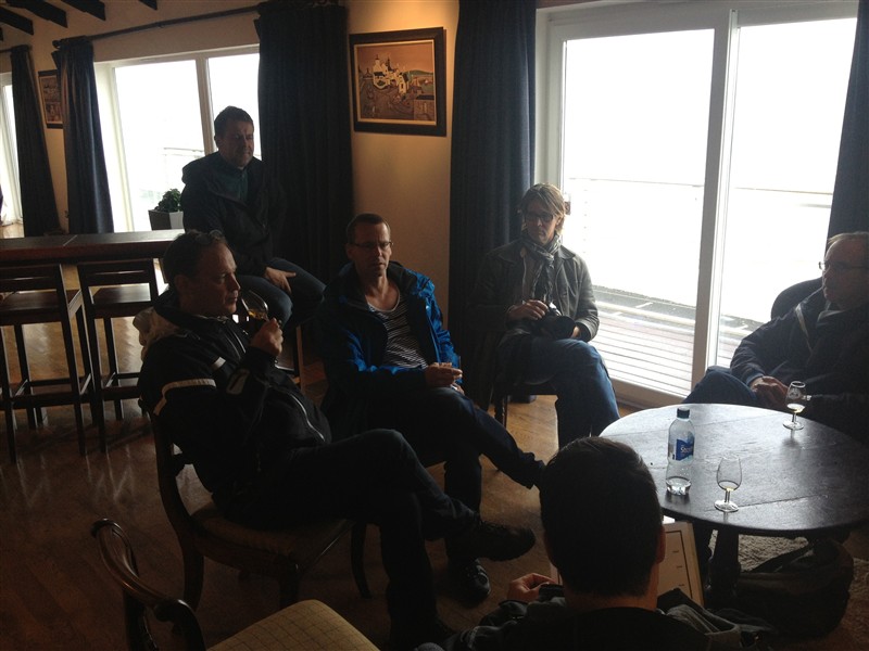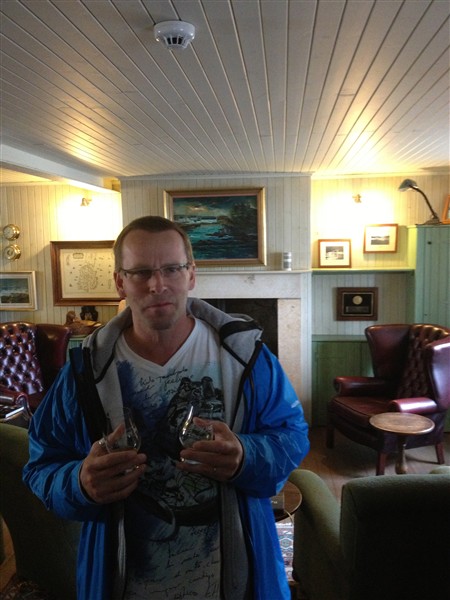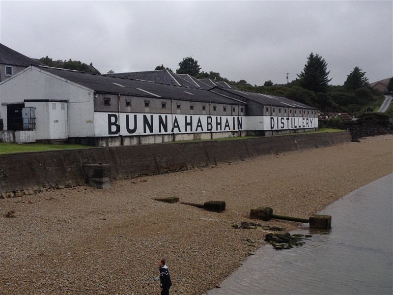 Kl 14.00 anländer vi till Bunnahabhain där vi har en tour bokad tillsammans med Distillery Manager Andrew Brown. En tur vi sent skall glömma. Mestadels beroende på hans dialekt. I princip omöjlig att förstå. Även om Håkan gjorde sitt bästa för att få honom att prata långsamt så uppfattade vi kanske var tredje ord och nätt och jämnt fick vi ihop sammanhanget. Andrew tyckte själv dock att han pratade långsamt och tydligt fick vi reda på efter turen; - "då skulle ni hört mig på krogen med grabbarna". I vilket fall som helst tog han oss genom destilleriet och vi fick smaka lite vört också. Inte speciellt gott men ack så trevligt. Det ger en alldeles speciell känsla när man väl står där. Efter avslutad tur slog vi oss ner och han guidade oss igenom en provning bestående av Darach'Ur, 18YO, 25YO, Peated samt new make. Vi var hyfsat eniga om att 25:an var bäst (även om en del tyckte bäst om 18YO) men knappast prisvärd med sina modiga £199. Flera av oss gick däremot därifrån med en 18YO i handen. Peter W kunde inte hålla sig utan traskade modigt ner till piren och hoppade i plurret. Inte direkt förvånande beteende från denna herre. Desto mer överaskande var att Håkan gjorde slag i saken och hoppade i även han. Kul killar det där!!