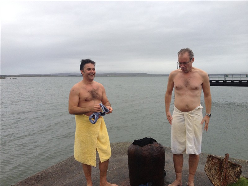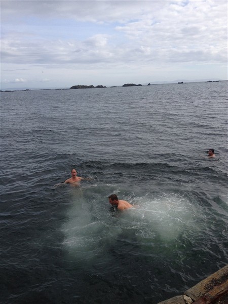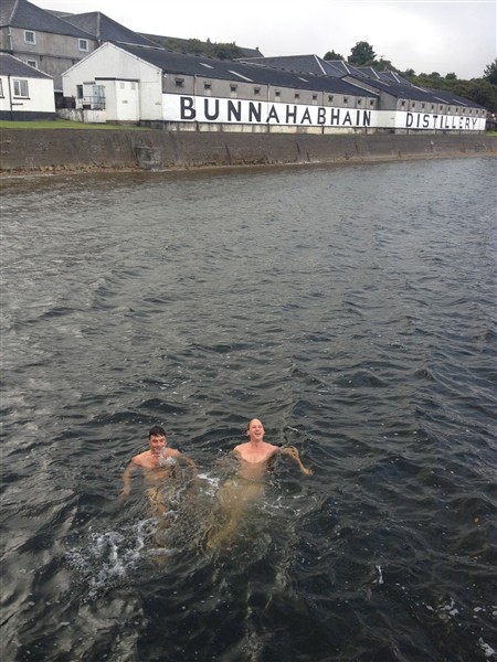 Turen avslutas nere på piren bakom destilleriet med en Galileo och sedan är det dags för bad igen. Peter givetvis men även Lasse och Håkan visar kalsongerna och hoppar i. 14 grader kanske. Brrrr men attans vad skönt efteråt. Det botaniserades lite i shopen, några glas inhandlades givetvis av bröderna Fernström som nu köper glas i parti och minut från alla åtkomliga destillerier.