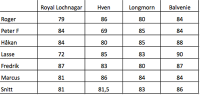 Sist ut kvällens självklara vinnare. Mycket god enligt alla. En hint av plåtlåda tyckte Håkan. Den var söt med inslag av sherry i doften men även ganska blommig. Smaken var väldigt salt. God och en hel del tobak och läder och som avslutades med en lång härlig finish. 86 pinnar i snitt.