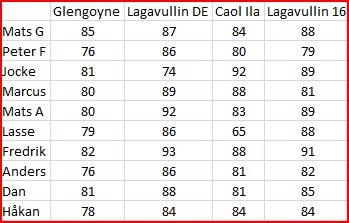 Anyways - fram åkte efter ett tag några referenswhiskies och kvällen kunde börja. Först ut var en whisky som på senaste provningen sågades av de flesta och den gjorde lite bättre ifrån sig denna gång - om än inte så mycket.